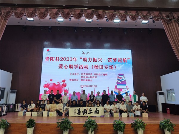 为深入学习贯彻党的二十大精神,弘扬新时代企业家精神,8月23日,由青阳县杨田镇商会赞助的“助力振兴·筑梦起航”爱心助学活动顺利举办。团县委书记产静、杨田镇党委书记陈长风、县工商联党组成员吴惠娴、杨田镇商会会长吴学文及商会爱心企业家代表参加活动。