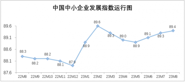 8月中国中小企业发展指数为89.4,比7月上升0.1点,这是继6月、7月分别上升0.2点之后,连续第三个月上升。