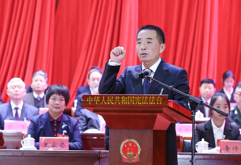 当主持人宣布选举结果时,会场响起热烈掌声。随后,贺东走到主席台前与全体代表见面,并向宪法宣誓。
