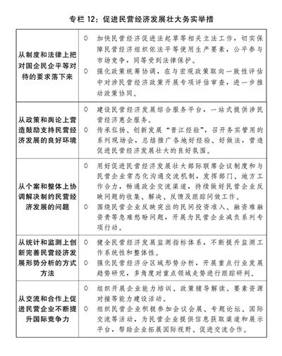 一是深入落实“两个毫不动摇”。推动各类所有制企业协同发展,充分激发各类经营主体的内生动力和创新活力。健全国有经济管理体系,深入实施国有企业改革深化提升行动,推动国有企业做强做优主业,增强核心功能、提高核心竞争力。出台中央企业支持和推动全国统一大市场建设行动方案。加快推动民营经济促进法起草等相关立法工作,充分发挥促进民营经济发展壮大部际联席会议制度作用,推动民营企业问题诉求解决,依法保护民营企业产权和企业家权益,进一步解决市场准入、要素获取、公平执法、权益保护等方面存在的突出问题,组织清理涉及不平等对待企业的行政法规、规章、规范性文件和政策文件,进一步破除影响各类所有制企业公平竞争、共同发展的制度障碍。提高民营企业贷款占比和发债融资规模。弘扬优秀企业家精神,支持企业家专注创新发展。开展百万民营企业员工职业技能提升行动。落实落细小微企业税费优惠政策,健全中小微企业和个体工商户公共服务体系,促进中小企业专精特新发展,加强对个体工商户分类帮扶支持。健全防范化解拖欠企业账款长效机制。完善中国特色现代企业制度。(见专栏12)