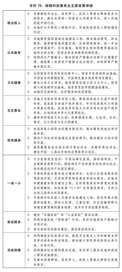 (十一)切实办好民生实事,基本民生保障有力。落实以人民为中心的发展思想,加强重点群体就业帮扶,积极促进城乡居民增收,完善“一老一小”、教育、医疗等公共服务体系,推动人民生活水平持续提高。