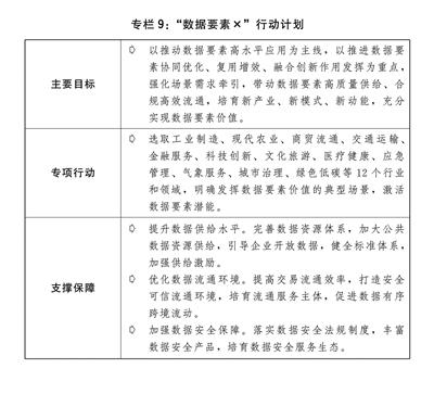 四是促进数字技术与实体经济深度融合。有序开发利用数据要素,加快完善数据产权、流通交易、收益分配、安全治理等制度规则,制定支持数字经济高质量发展政策措施。适度超前布局建设数字基础设施。统筹提升“东数西算”整体效能,优化数据中心建设布局和供给结构,加快形成全国一体化算力体系,培育算力产业生态,提升多元算力综合供给,提高西部地区算力利用水平。实施“数据要素×”行动计划。协同推进数字产业化和产业数字化,组织实施数字化转型工程,持续实施制造业数字化转型行动方案,打造具有国际竞争力的数字产业集群。开展全国数据资源调查,加强数据要素应用场景指引,推进公共数据资源管理和运营机制改革,加快公共数据授权运营试点和应用示范,推动建立企业数据公平授权合理使用机制。深化数据要素市场化配置改革。持续推进数据跨境流动试点,积极参与制定国际数字治理规则。(见专栏9)