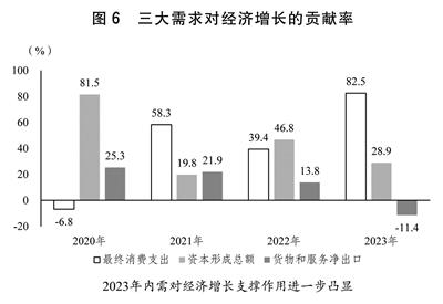 (二)积极促消费扩投资,内需支撑作用明显增强。坚定实施扩大内需战略,把恢复和扩大消费摆在优先位置,大力促进有效投资,内需对经济增长的贡献率达到111.4%,其中最终消费支出贡献率为82.5%。(见图6)