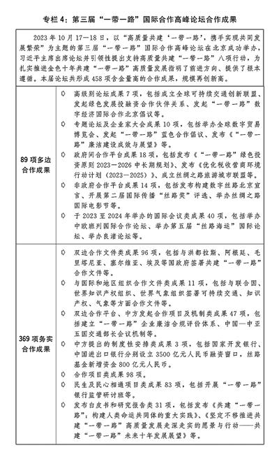 一是高质量共建“一带一路”取得丰硕成果。成功举办第三届“一带一路”国际合作高峰论坛,23个国家领导人和联合国秘书长应邀出席论坛,来自151个国家和41个国际组织的代表来华参会,形成458项合作成果。成功举办中国—中亚峰会,成立中国—中亚元首会晤机制。统筹推进标志性工程和“小而美”民生项目建设,中老铁路稳定高效运行,雅万高铁建成开通,非洲疾控中心等民生项目移交运营,鲁班工坊建设提质升级。数字经济、科技创新、绿色发展、卫生健康等新领域合作成果持续涌现。多边及区域框架下电子商务合作成效显著,“丝路电商”伙伴国增加至30个。中欧班列稳定畅通运行,通达欧洲25个国家的217个城市,全年累计开行1.7万列、运送货物190万标箱,分别增长6%和18%。国际产业与投资合作持续深化。在共建“一带一路”国家非金融类直接投资2240.9亿元,增长28.4%;与共建国家货物进出口19.47万亿元,增长2.8%,占外贸进出口比重提高至46.6%。创新开展共建“一带一路”十周年宣传。(见专栏4)