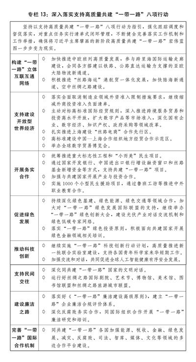 二是深入落实支持高质量共建“一带一路”八项行动。以落实好支持高质量共建“一带一路”八项行动的“1+8”实施方案为工作主线,统筹推进重大标志性工程和“小而美”民生项目,抓好第三届“一带一路”国际合作高峰论坛合作成果落实。巩固拓展合作基本盘,统筹完善与重点共建国家务实合作的政策体系,加强战略规划对接,稳步推动商签共建“一带一路”合作文件,落实好已签署的合作文件。举办中国—海合会(海湾阿拉伯国家合作委员会)国家产业与投资合作论坛。进一步提升中老、中越铁路效能,全力畅通面向东南亚的铁路运输通道。构建中欧班列高效运输、安全治理、多元通道、创新发展体系,优化中欧班列集结中心布局,推动中欧班列与西部陆海新通道班列有效衔接。推动沿边开发开放高质量发展,完善沿边重点开发开放试验区功能,提升边境口岸基础设施能力。积极推进“丝路海运”港航贸一体化发展。持续推进基础设施建设和互联互通合作。支持境内企业和境外企业合作建设陆海国际联运物流网络。稳步推进健康、绿色、数字、创新、廉洁丝绸之路建设。拓展和深化“丝路电商”合作。加快空中丝绸之路建设。加强涉外法治建设,构建共建“一带一路”涉外法律服务体系。加强境外投资引导、促进、服务、保护、监管和风险防控。(见专栏13)