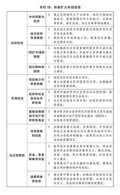 二是有效投资持续发力。积极发挥政府投资带动放大效应,制定中央预算内投资项目监管办法,加强和改进中央预算内投资计划管理。进一步扩大地方政府专项债券投向领域和用作项目资本金的行业范围,将保障性住房、城中村改造、普通高校学生宿舍等纳入专项债券投向领域。完善推进有效投资长效工作机制,强化用地、用海、用能、环评等要素保障,川藏铁路、西部陆海新通道、国家水网骨干工程等“十四五”规划102项重大工程以及其他经济社会发展重大项目取得重大进展。制定出台促进民间投资的17项措施,建立政府和社会资本合作新机制,鼓励民营企业参与特许经营项目,稳妥推进投贷联动试点合作,将消费基础设施等更多领域纳入基础设施领域不动产投资信托基金(REITs)发行范围。建立全国向民间资本推介项目平台,截至2023年末,各地通过平台公开推介项目6067个,项目总投资规模5.97万亿元。持续向金融机构推送制造业中长期贷款项目,并推动扩大贷款投放。全年全国固定资产投资(不含农户)50.30万亿元,增长3.0%。高技术产业投资增长10.3%,基础设施、制造业投资分别增长5.9%、6.5%,其中基础设施民间投资增长14.2%,制造业民间投资增长9.4%。