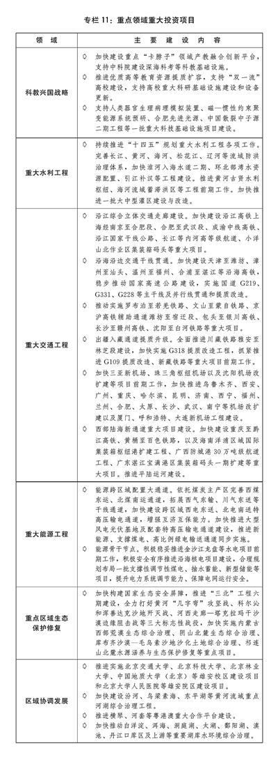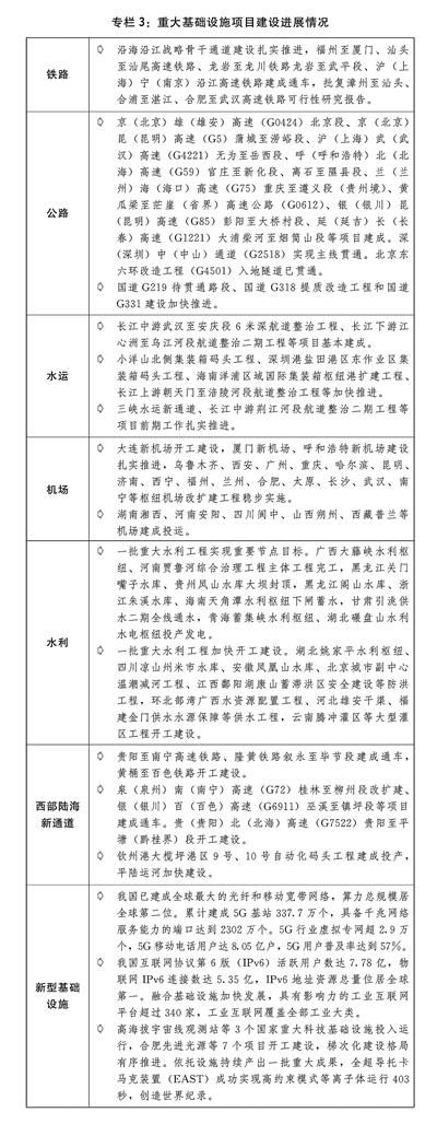 六是加快建设现代化基础设施体系。优化基础设施布局、结构、功能和系统集成,以联网、补网、强链为重点,畅通国家基础设施网络主骨架,促进高效衔接、协同联动,更好发挥基础设施体系的整体效能和综合效益。加快建设国家综合立体交通网。高质量推进川藏铁路、西部陆海新通道等重大工程建设,加快推动中西部铁路和高速铁路主通道建设,推进货运铁路建设,加强重点港口铁路专用线建设,规范有序推进城市轨道交通和市域(郊)铁路建设。扎实推进沿边、沿海、沿江等国家高速公路和国道未贯通路段及瓶颈路段建设。加快三峡水运新通道前期工作,构建干支衔接的内河高等级航道网络。完善运输机场、通用机场布局。加快推进沪甬跨海通道前期工作。全面推进国家水网建设。加快发展新型基础设施。统筹推进海陆缆建设,体系化推进5G、千兆光网规模部署,深入推动5G规模化应用。