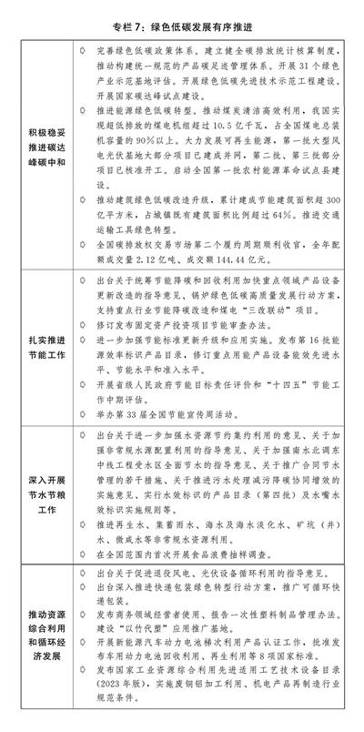 三是发展方式绿色转型步伐加快。出台加快推动制造业绿色化发展的指导意见、绿色工厂梯度培育及管理暂行办法,发布2023年度绿色制造名单。深入实施国家节水行动,制定全面加强水资源节约高效利用等政策,推进非常规水资源利用,开展公共供水管网漏损治理,万元国内生产总值用水量下降6.4%。大力发展循环经济,完善退役风电、光伏设备循环利用政策制度,深入推进废旧家用电器、汽车、电子产品、钢铁、有色金属循环利用。扎实推进60个废旧物资循环利用体系重点城市和100个大宗固废综合利用示范建设。加强月饼、茶叶、生鲜农产品等重点领域商品过度包装治理。(见专栏7)