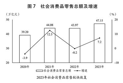 一是消费潜力进一步释放。出台实施恢复和扩大消费的20条政策措施。稳定和扩大汽车、家居、电子产品等重点消费,延续和优化新能源汽车车辆购置税减免政策,加快推进充电基础设施建设,全国充电基础设施累计达859.6万台。加强消费者权益保护,持续优化消费环境。推动文化、旅游、餐饮等生活服务消费加快恢复,全年服务零售额增长20.0%,国内出游人次、居民出游花费分别增长93.3%和140.3%。全年社会消费品零售总额达到47.15万亿元,增长7.2%,其中,网上零售额达到15.43万亿元,增长11.0%。成功举办中国品牌日活动。开展“消费提振年”活动。加快国际消费中心城市培育建设。(见图7)