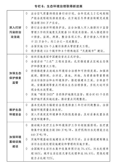 一是生态环境保护治理不断强化。召开全国生态环境保护大会,出台关于全面推进美丽中国建设的意见。举办首个全国生态日主场活动。扎实推进蓝天、碧水、净土保卫战,组织开展第三轮第一批中央生态环境保护督察,生态环境质量稳中改善,全国地级及以上城市细颗粒物(PM2.5)平均浓度为30微克/立方米,全国地表水Ⅰ—Ⅲ类水质断面比例为89.4%、提升1.5个百分点,土壤重金属污染防治取得积极成效。健全生态环境分区管控体系。推动全面实行排污许可制。深入推进塑料污染全链条治理,实施“以竹代塑”发展三年行动。加快实施重要生态系统保护和修复重大工程,加强水土流失、荒漠化综合防治,完成水土流失治理面积6.3万平方公里,全国水土保持率达到72.5%,完成“三北”工程总体规划修编和六期规划编制。完成国土绿化任务1.26亿亩。(见专栏6)