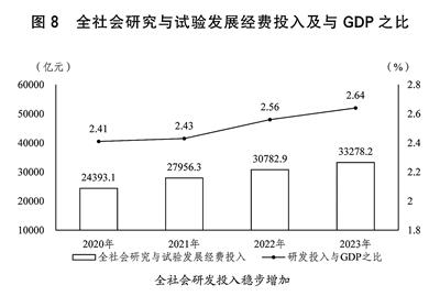 (三)大力强化创新驱动,高水平科技自立自强成效明显。深入实施创新驱动发展战略,加快形成支持全面创新的基础制度,加强科技发展规划、改革、政策等顶层设计,国家创新体系整体效能持续提升。全社会研究与试验发展(R&D)经费投入33278.2亿元,增长8.1%,与国内生产总值之比达到2.64%;基础研究持续加强,基础研究经费投入占研发经费投入比重为6.65%。(见图8)