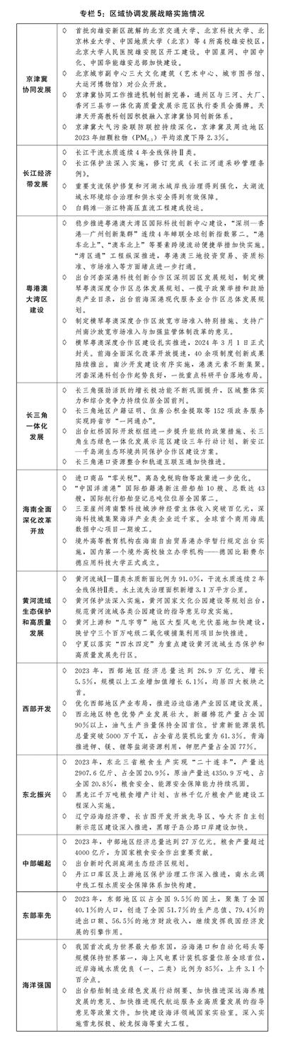 一是区域发展协调性增强。出台支持高标准高质量建设雄安新区的政策措施,高校、医院、中央企业总部等北京非首都功能疏解项目加快在雄安新区落地建设,第二批北京市属行政企事业单位迁入城市副中心加快推进。制定进一步推动长江经济带高质量发展的政策措施,城镇污水垃圾、化工、农业面源、船舶和尾矿库污染治理工程系统推进,长江十年禁渔取得明显成效,Ⅰ—Ⅲ类水质断面比例达到95.6%。粤港澳大湾区规则衔接、机制对接不断深化,交通等基础设施硬联通和职业资格互认等规则软对接走向深入,横琴、前海、南沙、河套等重大合作平台建设取得新突破。长三角一体化高质量发展走深走实,上海“五个中心”建设步伐加快,以长三角生态绿色一体化发展示范区为突破口的一体化发展体制机制不断完善。海南自由贸易港制度型开放步伐加快,“一线放开、二线管住”进出口管理制度试点稳步扩大。黄河流域重点工程加快实施,环境污染综合治理工程深入推进,流域涉水公园建设得到有效规范。