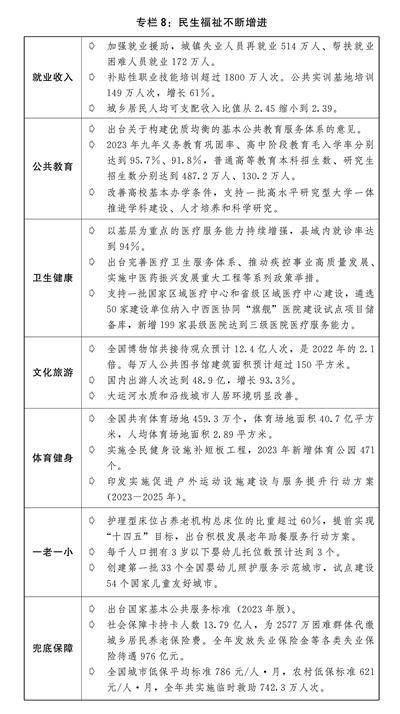 ——居民人均可支配收入增长与经济增长同步。主要考虑:这一预期目标比2023年“基本同步”的提法更为积极,进一步体现了增加居民收入的政策导向。随着经济持续回升向好,扩大中等收入群体、增加低收入群体收入等政策进一步加力,实现这一目标既有支撑,也需要付出努力,在实际工作中力争更好结果。