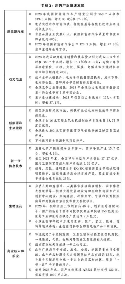 二是战略性新兴产业蓬勃发展。完善支持战略性新兴产业高质量发展的政策体系,推动产业融合集群发展。新能源和未来能源、新一代信息技术、生物医药、商业航天和航空等新兴产业加快发展。北斗产业规模稳步增长,全面服务关键重点行业领域,加速成为公众消费产品标配应用。全国首个商业航天发射场加快建设。推动新能源汽车企业优化重组和做强做优,开展公共领域车辆全面电动化试点,新能源汽车产销量连续9年位居全球首位、全年销量占新车销量比重超过30%。人工智能、生物制造等未来产业有序布局。(见专栏2)