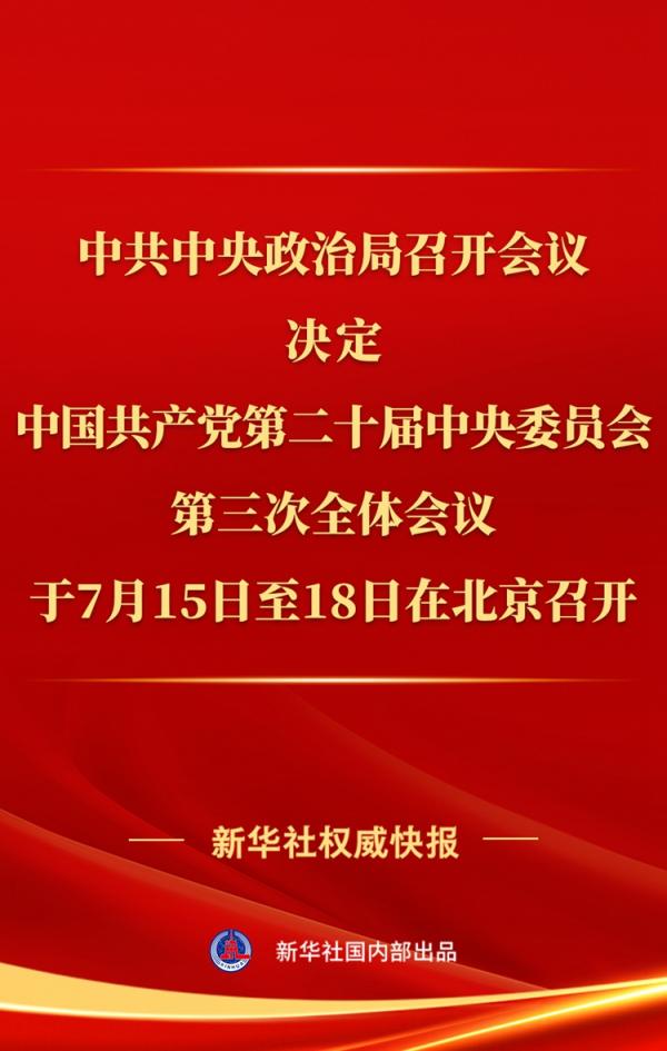 会议决定,中国共产党第二十届中央委员会第三次全体会议于7月15日至18日在北京召开。