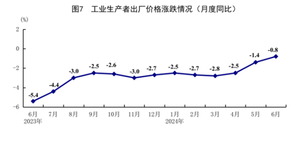 上半年,全国工业生产者出厂价格同比下降2.1%,降幅比一季度收窄0.6个百分点。其中,6月份同比下降0.8%,环比下降0.2%。上半年,工业生产者购进价格同比下降2.6%。其中,6月份同比下降0.5%,环比上涨0.1%。