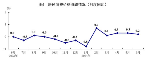 上半年,全国居民消费价格(CPI)同比上涨0.1%,一季度为同比持平。分类别看,食品烟酒价格下降1.4%,衣着价格上涨1.6%,居住价格上涨0.2%,生活用品及服务价格上涨0.9%,交通通信价格下降0.7%,教育文化娱乐价格上涨2.0%,医疗保健价格上涨1.4%,其他用品及服务价格上涨3.3%。在食品烟酒价格中,鲜果价格下降7.8%,鲜菜价格下降2.7%,猪肉价格持平,粮食价格上涨0.5%。扣除食品和能源价格后的核心CPI同比上涨0.7%。6月份,全国居民消费价格同比上涨0.2%,环比下降0.2%。