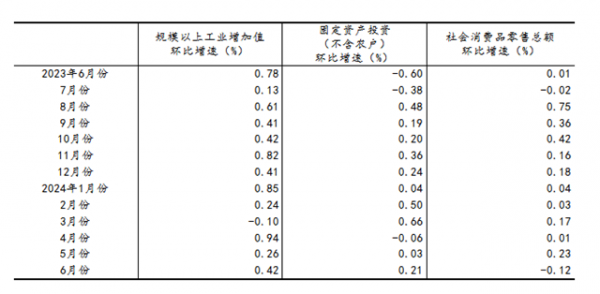 (2)根据季节调整模型自动修正结果,对近一年来各期国内生产总值、规模以上工业增加值、固定资产投资(不含农户)、社会消费品零售总额环比增速进行修订。修订结果及2024年二季度GDP环比数据、2024年6月份其他指标环比数据如下: