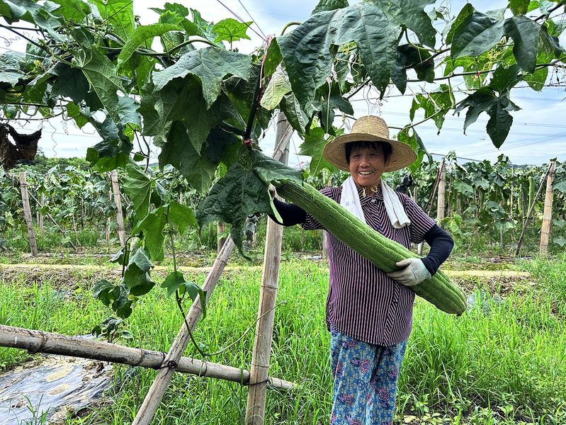 丝瓜络产业每年为贵池区唐田镇尚书村集体增收30余万元。图为村民在采摘丝瓜。