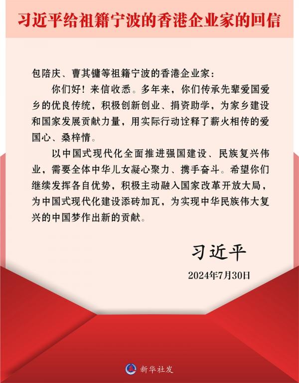 近日,国家主席习近平给包陪庆、曹其镛等祖籍宁波的香港企业家回信,对他们予以亲切勉励。